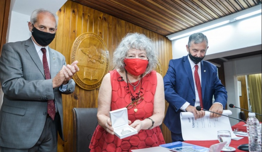 Fue el rector Daniel Pizzi quien le entregó este reconocimiento, junto a la resolución que lo habilita. El decano de la Facultad de Filosofía y Letras, Adolfo Cueto, la honró además con una medalla. Esta Unidad Académica ofició de anfitriona y albergó el acto que fue transmitido vía streaming, por el canal Señal U Académico, nada más ni nada menos que el Día Internacional de la Mujer.