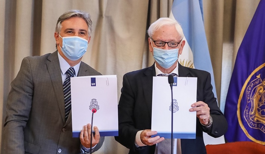 El rector Hugo Juri y el intendente Martín Llaryora formalizaron el acuerdo este martes en la sala de sesiones del Consejo Superior con el objetivo de contribuir a la construcción conjunta de herramientas que mejoren la calidad de vida y la salud de los niños de las escuelas municipales y de quienes acceden a los parques educativos de la Municipalidad de Córdoba, desde una mirada integral y enfoque de derechos humanos.
