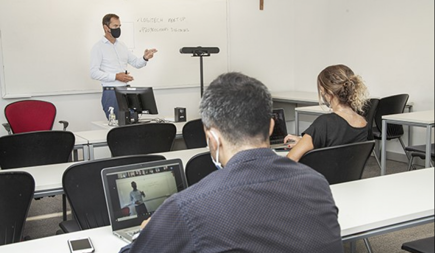Las clases híbridas serán impartidas en el aula del campus con estudiantes presentes al mismo tiempo que otros alumnos asisten a la misma en forma remota. Todo ello se realiza de manera sincrónica, online y en vivo. Asimismo, los alumnos cuentan con un LMS (Learning Management System) que complementa la enseñanza de modo asincrónico.