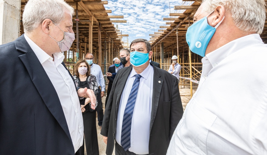 “La obra del Edificio de Aulas de Costanera Este – Ciudad Universitaria cuenta con un avance del 40%. Esperamos poder avanzar en los próximos meses para que el año que viene podamos empezar el ciclo lectivo aquí”, explicó el rector Mammarella tras la recorrida de la que también participó el director de Obras y Servicios Generales de la UNL, Marcelo Saba.