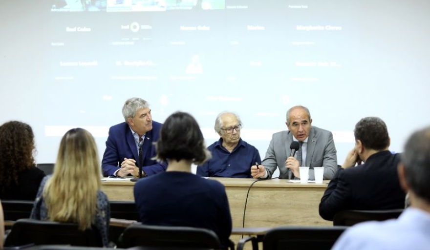 El presidente de la UNLP, Martín López Armengol, participó de la ceremonia inaugural acompañado por la prosecretaria de Derechos Humanos y Políticas de Igualdad, Verónica Cruz y el secretario de Relaciones Institucionales, Javier Mor Roig y el director de la Cátedra, Francesco Vigliarolo.