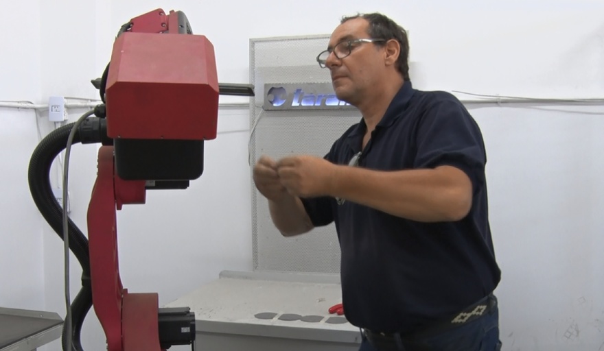 El profesor Edgardo Pringles, de la especialidad Electromecánica de la EIDFS, explicó que el robot es “una estructura antropomórfica”, es decir que es como un brazo que tiene movimientos similares a los del ser humano. “Está equipado con seis motores que proveen movimientos, por lo que puede hacer múltiples tareas. Funciona con una computadora industrial y con un teclado, que es la interface con el usuario. Se le ejecuta un programa y se le hace hacer maniobras repetitivas, algo que sería muy tedioso para un humano”, dijo. Luego, Pringles contó que la empresa Taranto tiene otra cantidad de estos robots para instalar en su planta de Chimbas. “Entonces -sugirió el docente-, esto implica que el personal que va a contratar la empresa tiene que estar capacitado en el manejo de estos equipamientos, y de aquí a que esos robots estén instalados, va a ser muy bueno que la Escuela pueda brindarles esa capacitación a los alumnos”.