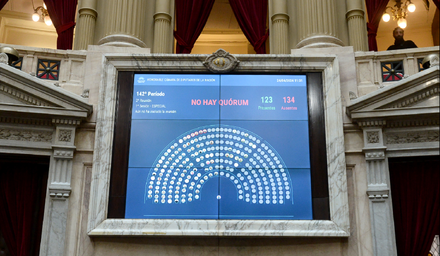 A las 11.30, cuando el presidente de la Cámara baja, Martín Menem, dio por caída la sesión, se habían sentado en sus bancas 124 legisladores nacionales de los 129 necesarios para habilitar el tratamiento, entre ellos la mitad del bloque radical, un sector minoritario de Hacemos Coalición Federal y los cinco diputados del Frente de Izquierda.