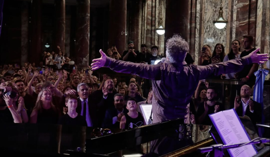 Tras el discurso, llegaron las canciones. Un recorrido íntimo por obras emblemáticas como Caminando por Rosario, La vida es una moneda, Ciudad de Pobres Corazones y Mariposa Tecknicolor, entre otros clásicos que hicieron vibrar al auditorio. El cierre, a capela y con el público de pie, fue con Yo vengo a ofrecer mi corazón, coronando una noche de emociones compartidas.