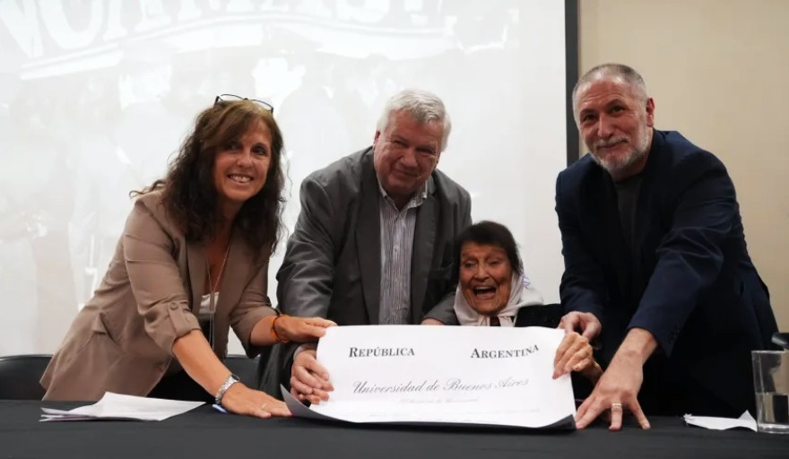 La Universidad de Buenos Aires (UBA) otorgó el viernes pasado el Doctorado Honoris Causa a Taty Almeida, en reconocimiento a su trayectoria en la defensa de los derechos humanos y su rol central en la denuncia de los crímenes cometidos durante la última dictadura cívico-militar iniciada en 1976. La ceremonia se realizó en la Facultad de Filosofía y Letras, con la presencia de autoridades académicas, familiares y representantes de organismos de derechos humanos.